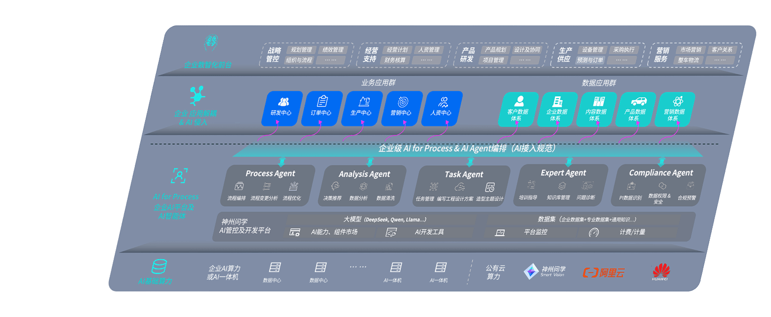 端到端的一站式AI工作空间深度融合了从企业战略规划到日常经营的全流程业务板块,,,,定向解决车企内部领域多、、、、部门多、、链条长、、、场景碎片化等难题,,,支持车企快速构建以AI为核心的生产力写作体系,,实现任务执行与AI能力的无缝集成与交互