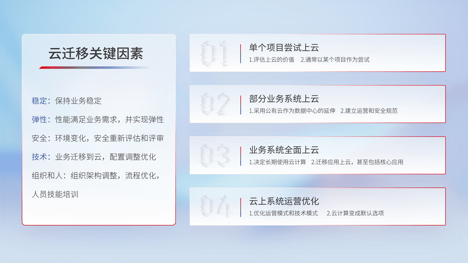 结合实际业务,,从规划设计、、、云平台选型、、、云原生改造、、数据迁移、、、集成交付,,,迁移全过程为客户识别最佳上云路径,,,做好风险识别管理,,设计网络架构、、、、身份权限、、安全审计合规、、、、操作审计、、、日志审计、、、监控告警策略、、、多站点容灾设计等,,对云上基础设施进行整体规划,,提升IT治理水平,,,以满足弹性、、、高可用、、、、高性能的需求。。。。